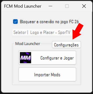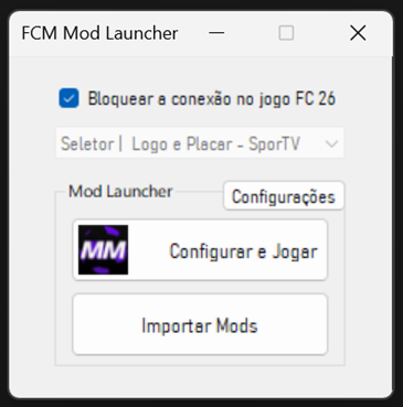 - Ao entrar no jogo, no menu principal, saia do jogo. Quando retornar à área de trabalho, feche o "FCM Mod Launcher", abra-o novamente e marque a opção "Bloquear a conexão no jogo FC 26".