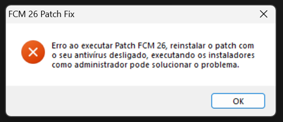 - É provável que o seu antivírus ou o Windows Defender tenha excluído o "FCM 26 Patch Fix" na pasta FCM 26.