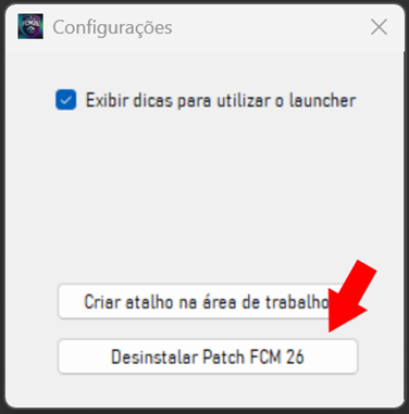Obs.: O patch será totalmente removido e o próprio Launcher restaurará as permissões de firewall necessárias para jogar online. Use esta opção sempre que quiser desinstalar a versão antiga do patch e instalar uma nova. essa funcionalidade está disponível apenas no FCM 25/FCM 26.