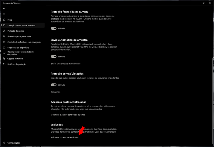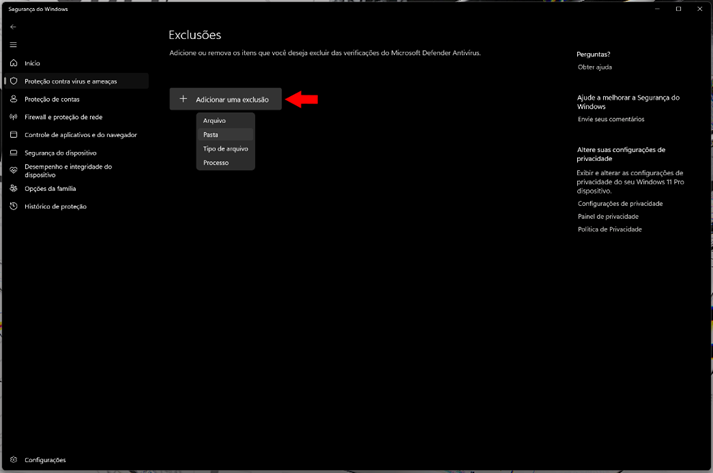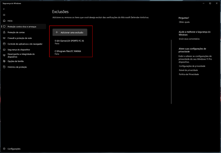 - Adicione duas pastas às exclusões do Defender: pasta do jogo e a pasta do patch instalado. Isso evita bloqueios em instalações/reinstalações, se você mudar o local de instalação do jogo ou do patch, refaça as exclusões apontando para as novas pastas.