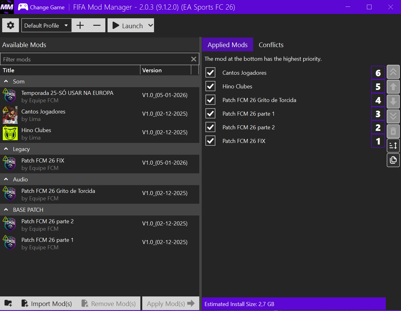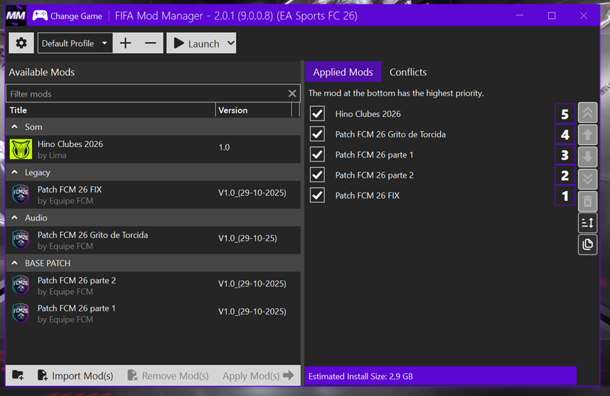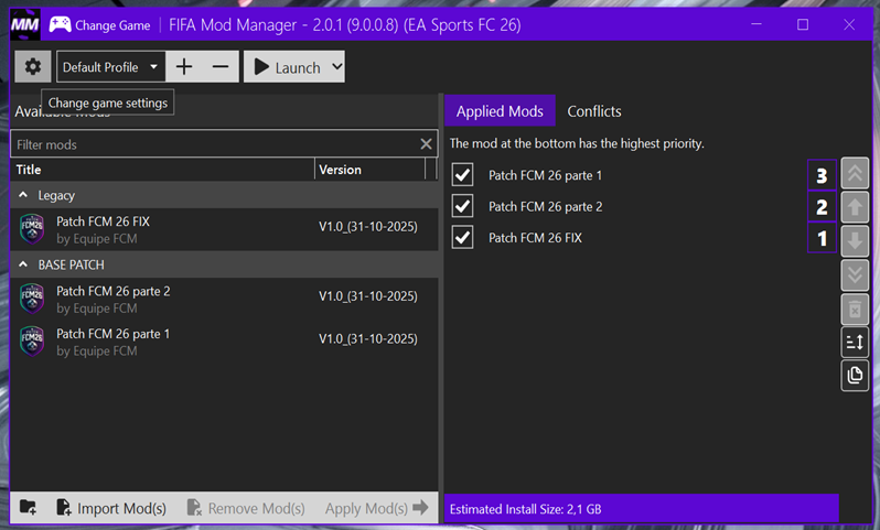 No FIFA Mod Manager: Recomendamos a instalação desta forma, ordem dos Mod(s):