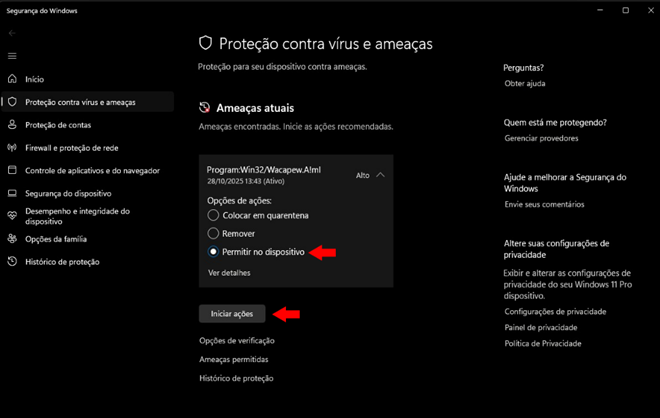 "Ameaça em quarentena"- Detecção: Program:Win32/Wacapew.A!ml