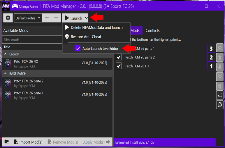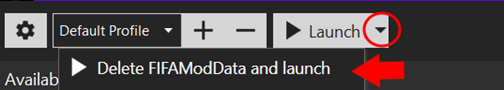 - Abra o seu FCM Mod Launcher, clique no triângulo ao lado de "Launch" e selecione a opção "Delete FIFAMODDATA and launch".