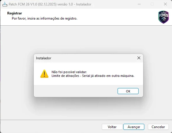 Esse aviso indica que a licença já está vinculada a 1 (um) dispositivo, ficando permanentemente vinculada ao primeiro computador em que for instalada. Qualquer tentativa de ativar o mesmo serial em outro dispositivo será automaticamente bloqueada pelo sistema.