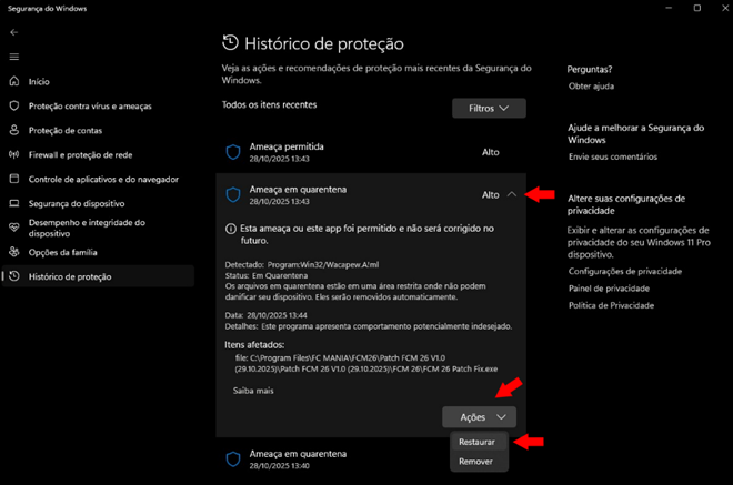 No caso mostrado, o sistema marcou o arquivo "FCM 26 Patch Fix.exe" como Program:Win32/Wacapew.A!ml, bloqueando-o por engano.