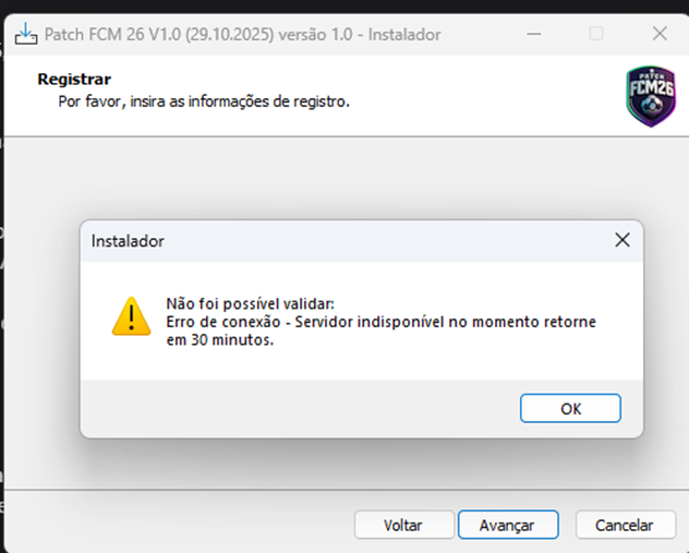 Esse aviso indica que o instalador não conseguiu se comunicar com o servidor de validação no momento. Isso pode ocorrer por instabilidade temporária na rede local ou na rota até o servidor, e não significa que o serial é inválido.